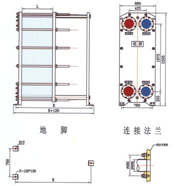 框架包括一個(gè)固定壓緊板和一個(gè)活動(dòng)壓緊板,由上導(dǎo)桿與下導(dǎo)桿支承,在另‘端有一支柱。壓制成的波紋板片懸掛在兩板之間的上導(dǎo)桿上,移動(dòng)活動(dòng)壓緊板將板片組壓緊,再用一組夾緊螺柱將固定壓緊板和活動(dòng)壓緊板夾緊至一定尺寸。兩種介質(zhì)經(jīng)固定(或活動(dòng))壓緊板上法蘭孔流入由波紋板片組成的各自通道,熱交換后介質(zhì)再由固定(或活動(dòng))壓緊板上的法蘭孔流出。同定壓緊板、活動(dòng)壓緊板、支柱及導(dǎo)桿均為低碳鋼??紤]到用戶的多種使用要求,框架設(shè)計(jì)有多種型式,主要有雙支撐框架式和常用的落地式等,也可根據(jù)用戶的要求更改框架的型式。